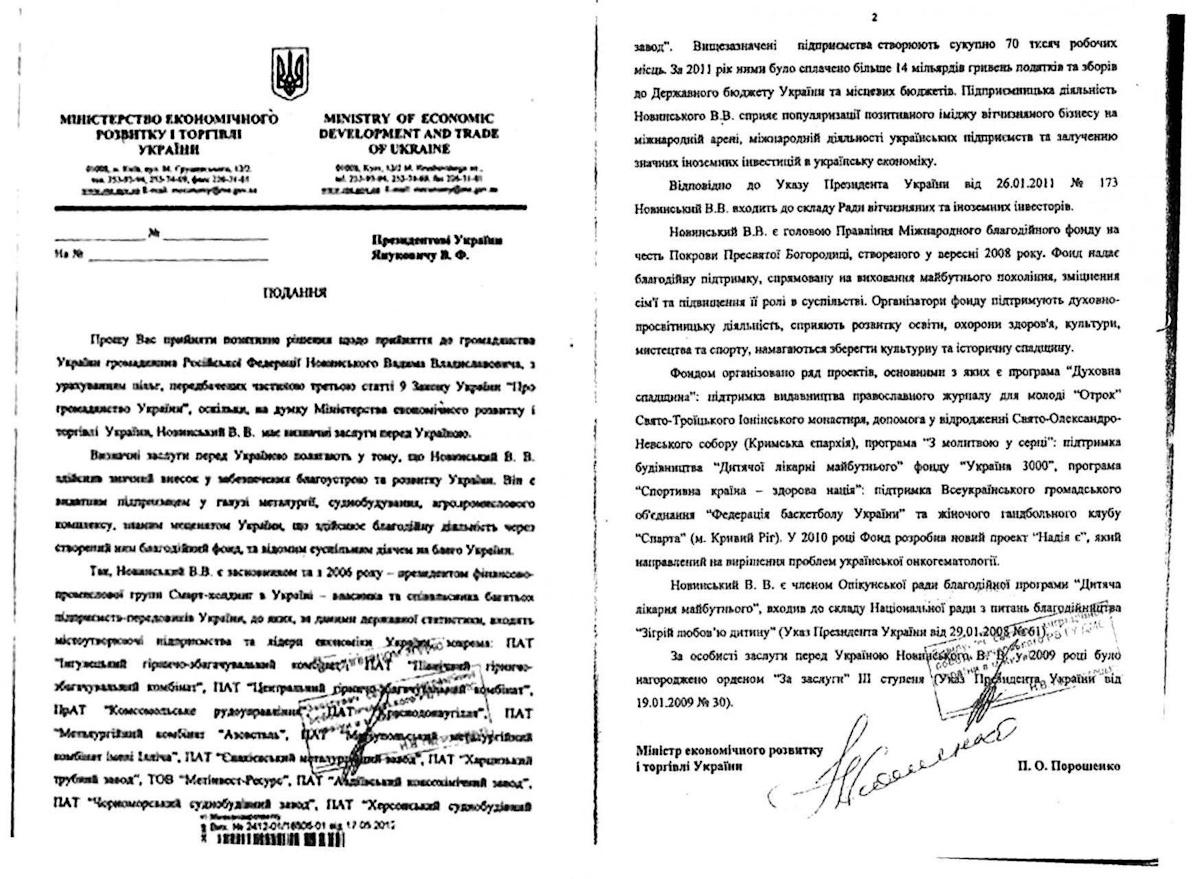Експерт нагадав також історію з Вадимом Новинським – відомим лобістом московського патріархату, який отримав український паспорт за поданням Порошенка. У документі, який опублікував експерт, Петро Порошенко звертається до на той момент президента Януковича та просить надати Новинському громадянство України. При цьому, політик перелічує заслуги цього російського олігарха перед Україною, які полягають у відновленні храмів московського патріархату.